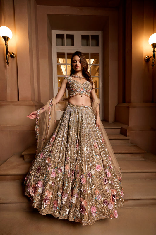 SOFT GOLD CAMELLIA 3D EMBROIDERED LEHENGA SET