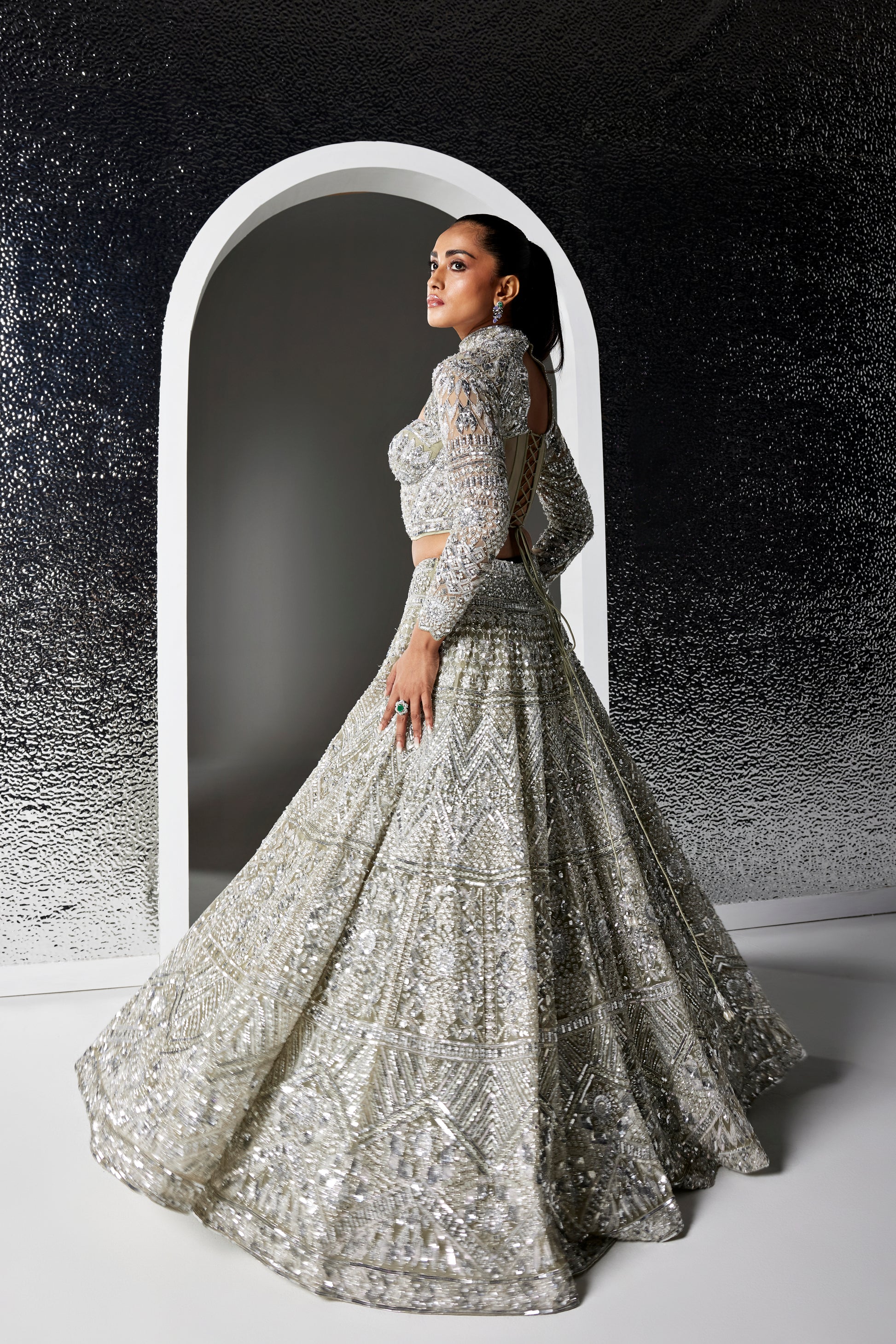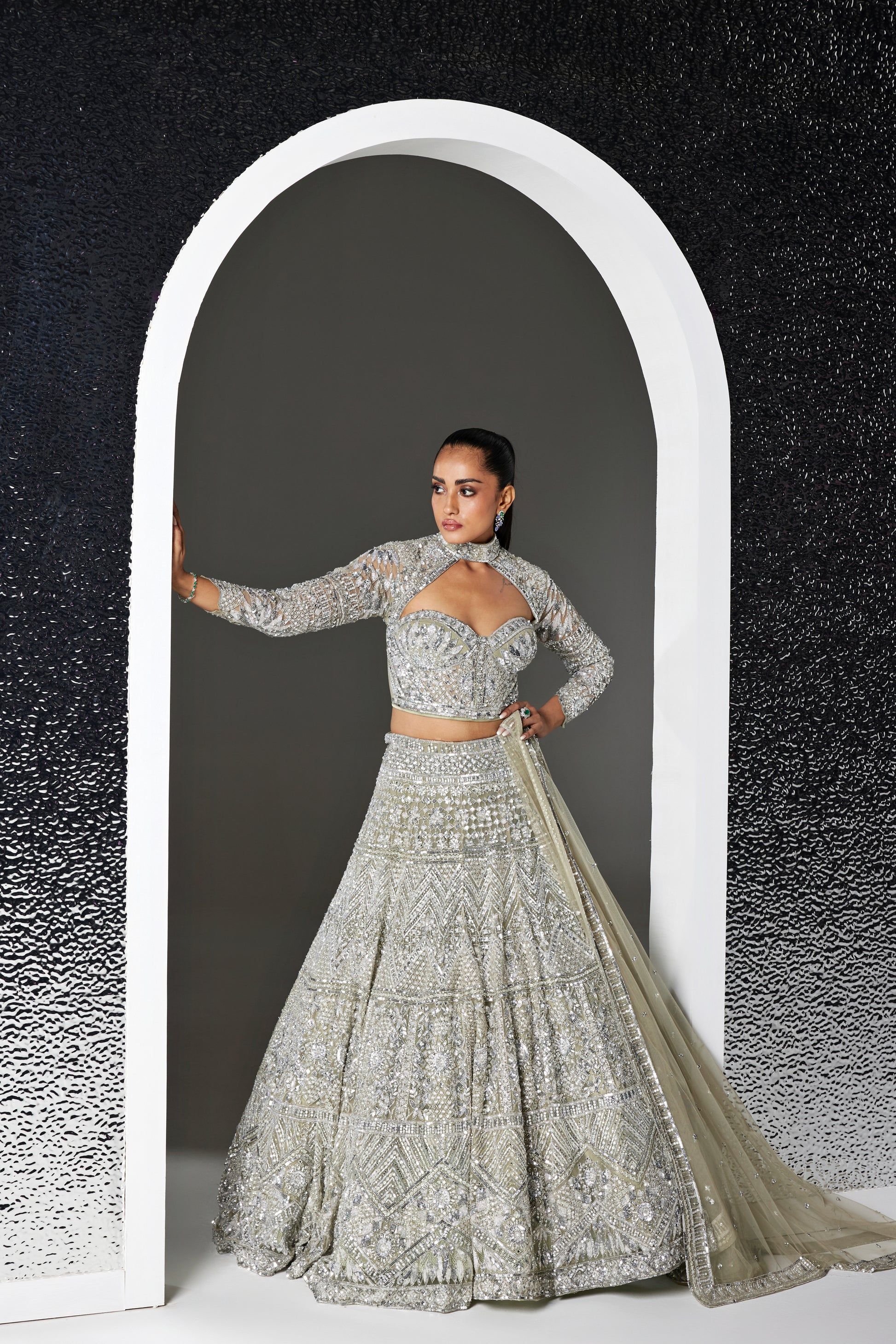 DULL GREEN AND SILVER IRIS LEHENGA SET
