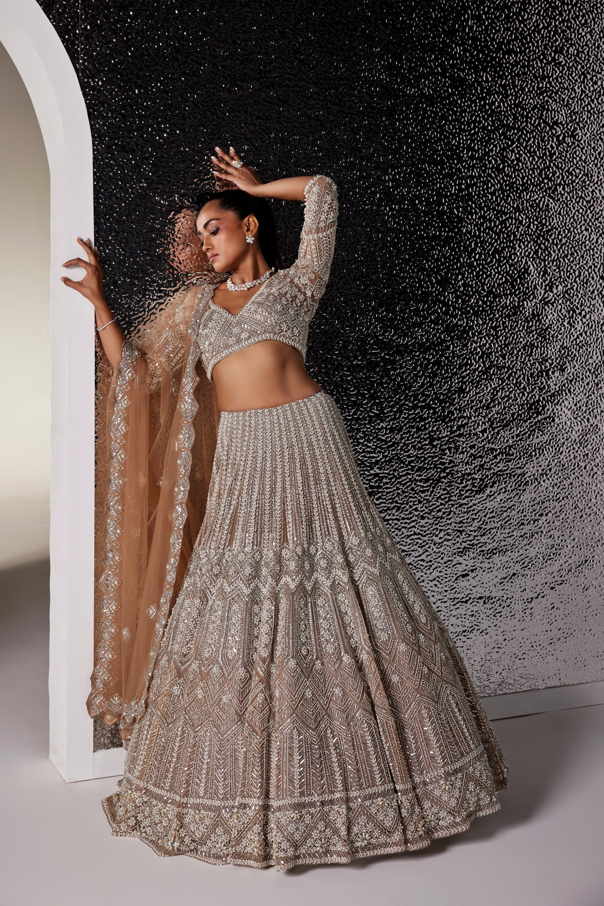 DULL BROWN AND SILVER CHARLOTTE LEHENGA SET