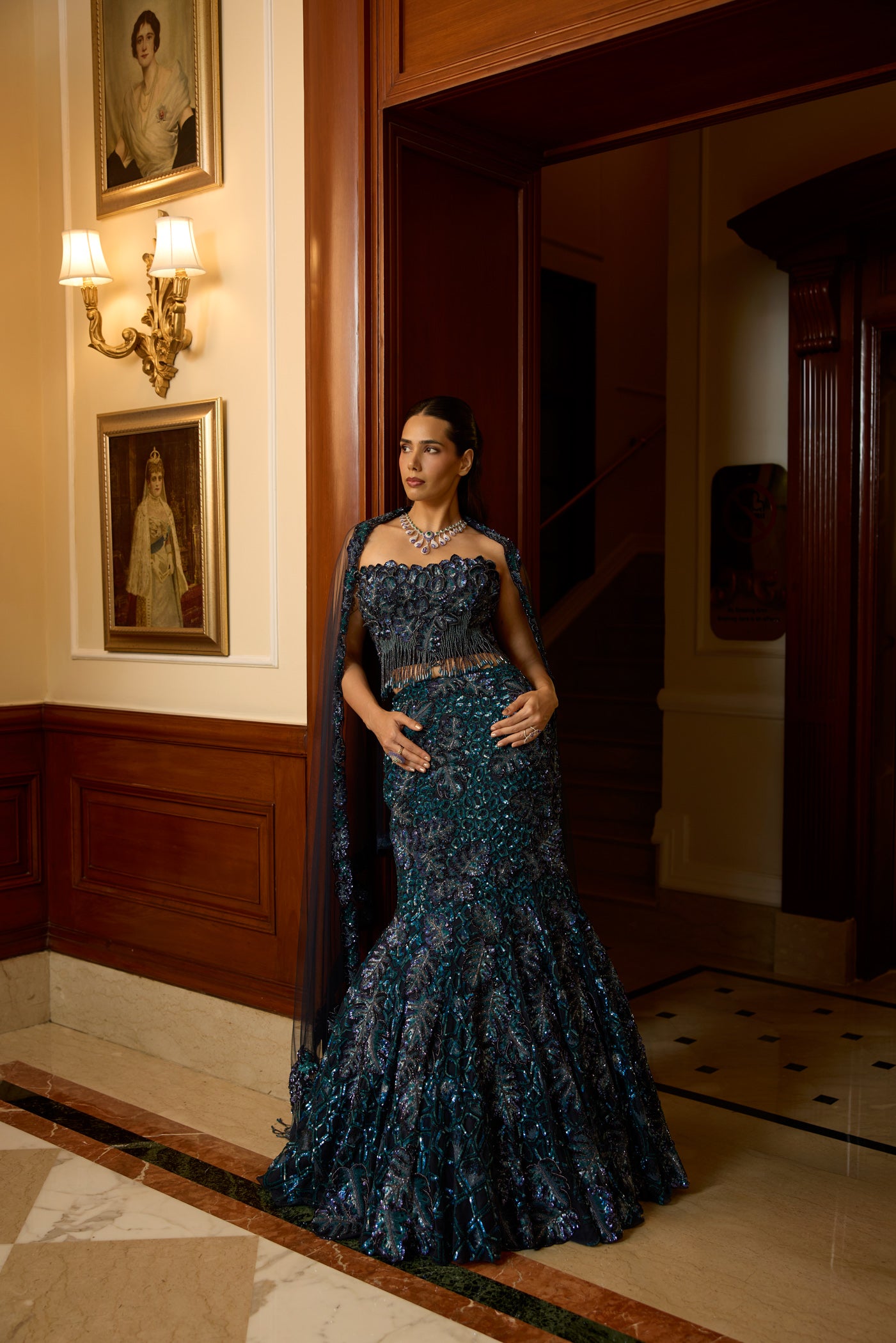 PEACOCK BLUE VIOLET FISHCUT LEHENGA CORSET SET