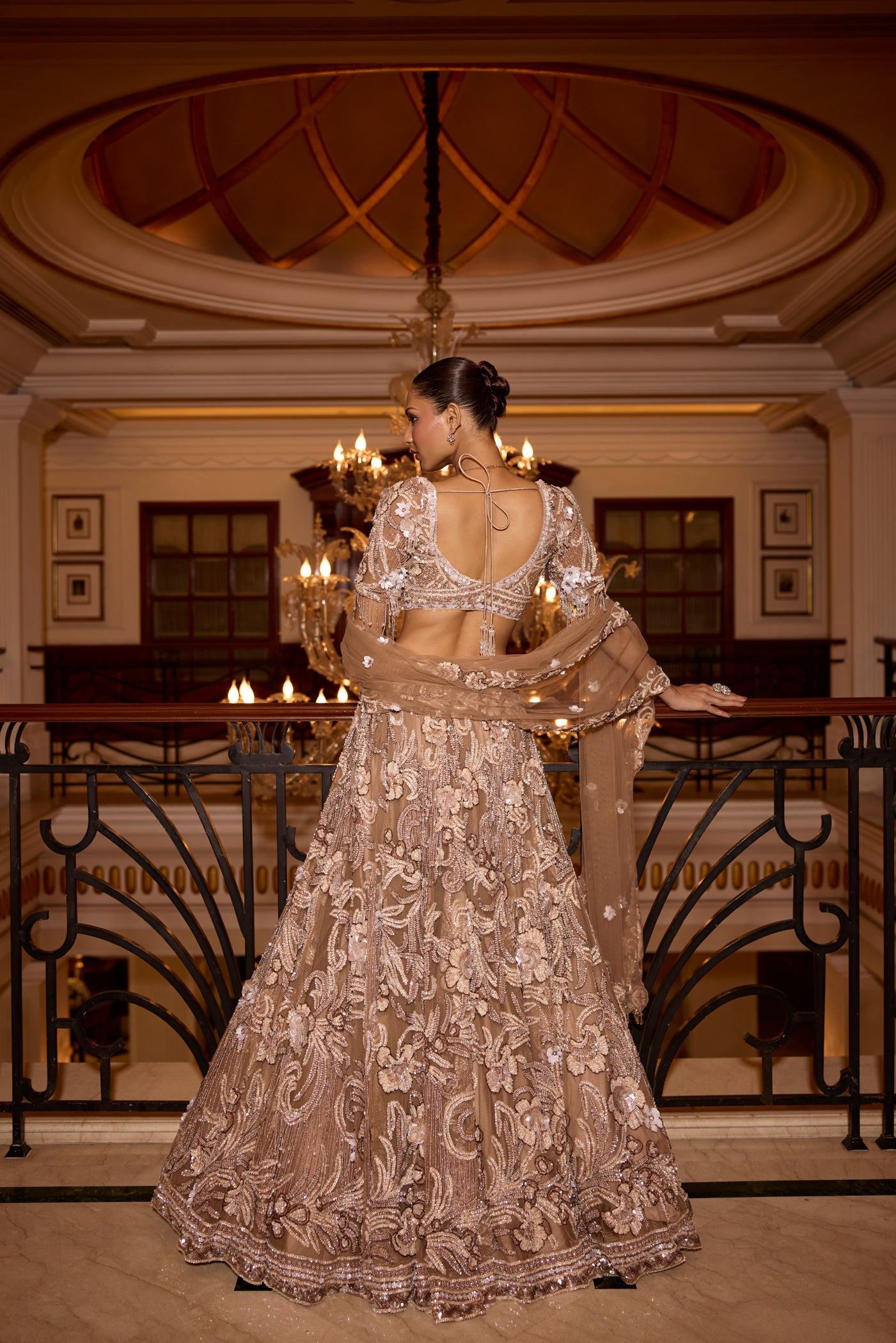 SOFT GOLD CAMELLIA 3D EMBROIDERED LEHENGA SET